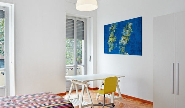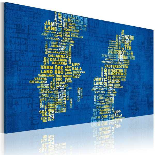 Quadro mappamondo - Mappa del testo di Svezia (sfondo blu)