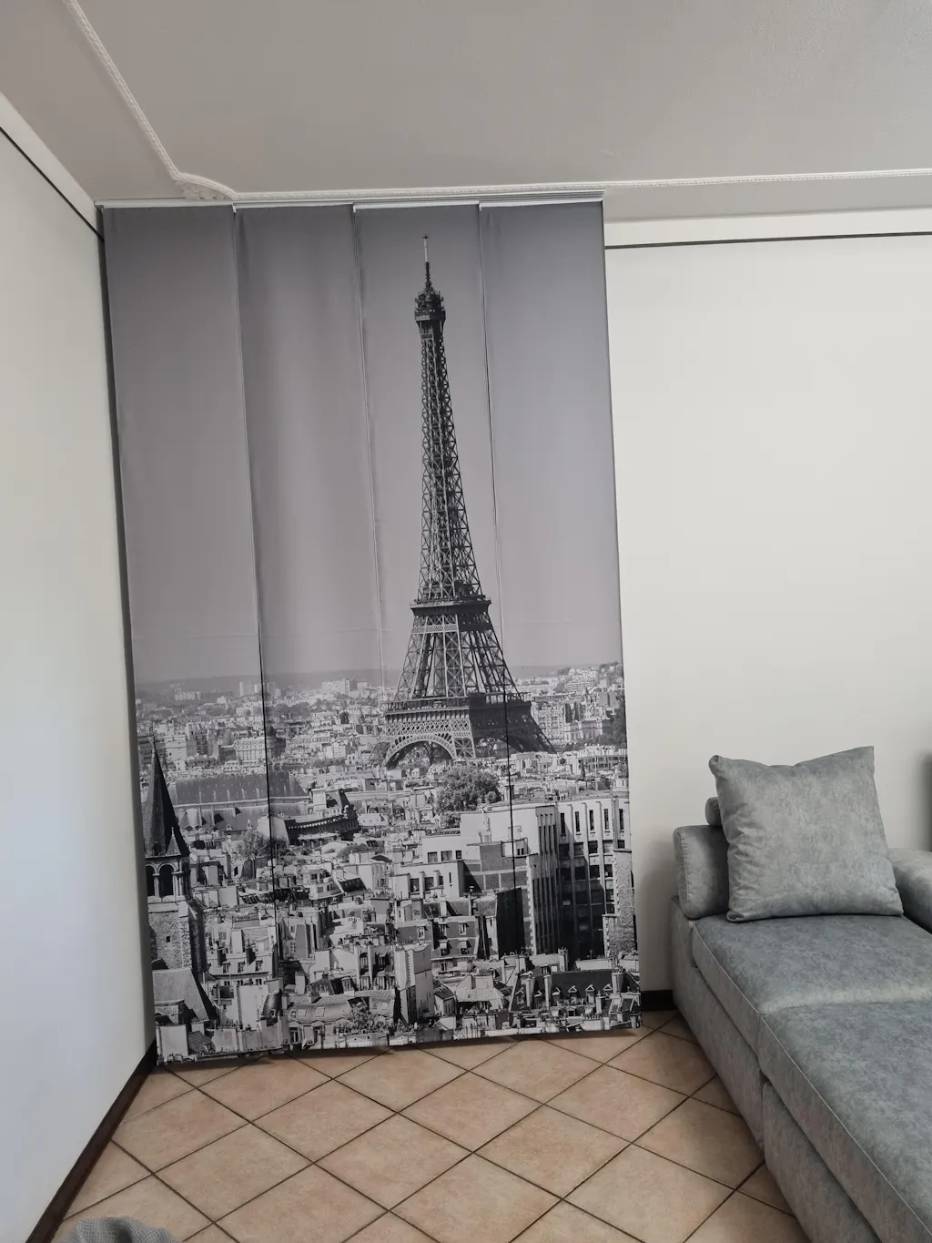 Tenda a pannello su misura, oscurante, ottimo servizio di consulenza, spedizione velocissima, bellissimo il disegno e i colori. Facile da montare. Ottimo rapporto qualità prezzo.