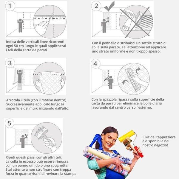 Tutti i nostri parati sono composti da strisce verticali della larghezza di 50cm e della lunghezza del fotomurale. Se per esempio, il fotomurale scelto è di misura 400x280cm sarà composto da: 400cm / 50 cm = 8 strisce (di altezza 280cm). Questo rende ancora più semplice e rapido il montaggio dell'intera carta da parati sulla vostra parete.