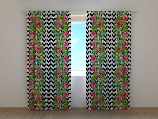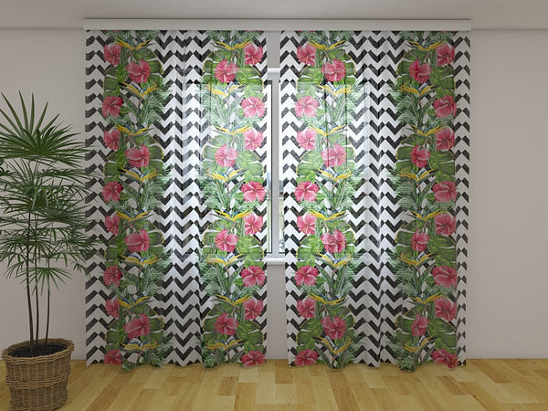 Foto Tende con Stampa Foglie Tropicali e Fiori di Ibisco